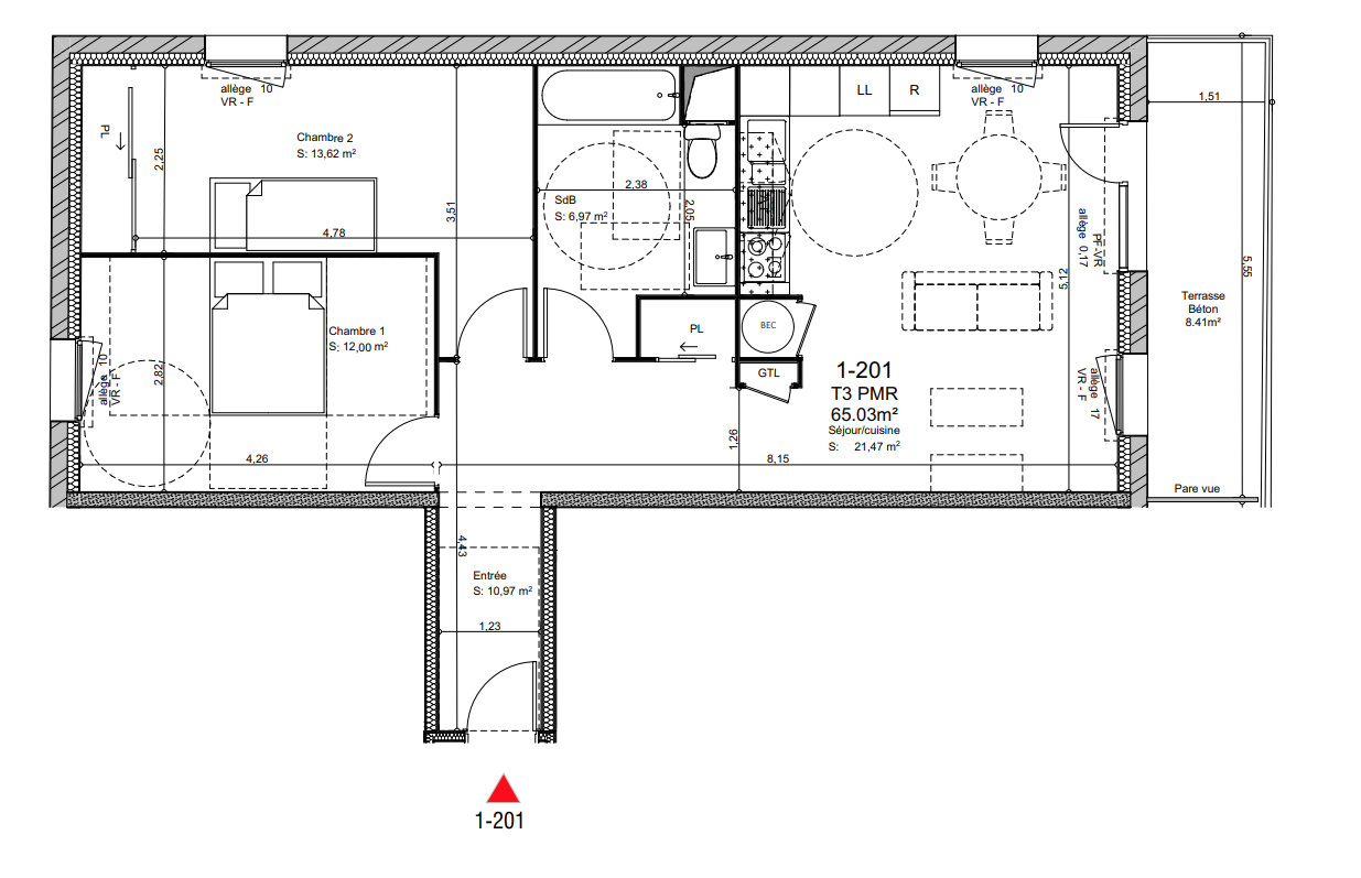 167 700€ Appt. T3 65.03m2 1er