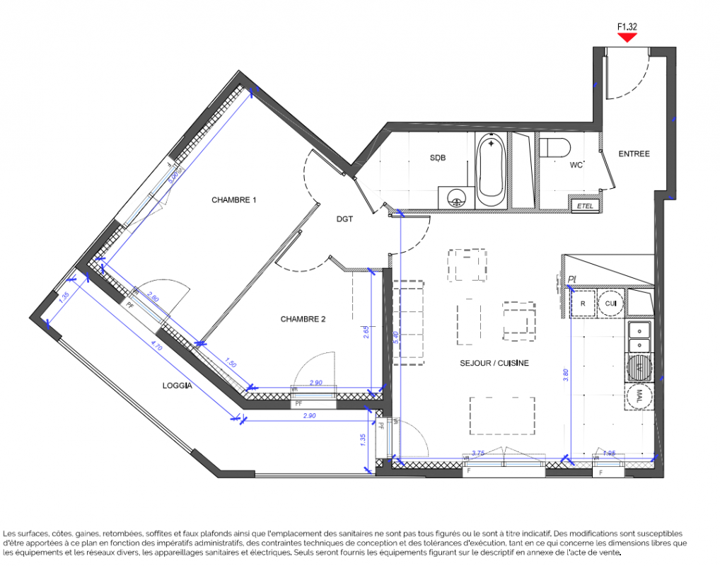414 028€ Appt. T3 68.3m2 0-RDC